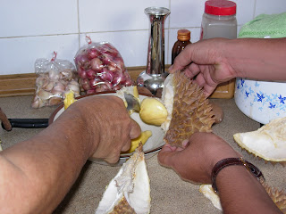 Look at the size of the durian. (Its the month of May and there are durians for sale.) In fact, durians in Thailand are almost year round. The durians there are very big in size, taste sweet, do not have the strong smell and does not feel sticky. It taste pretty awesome ...
